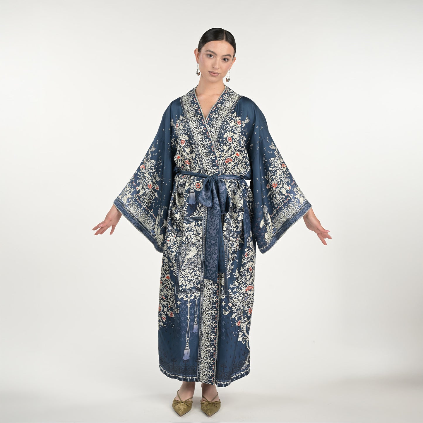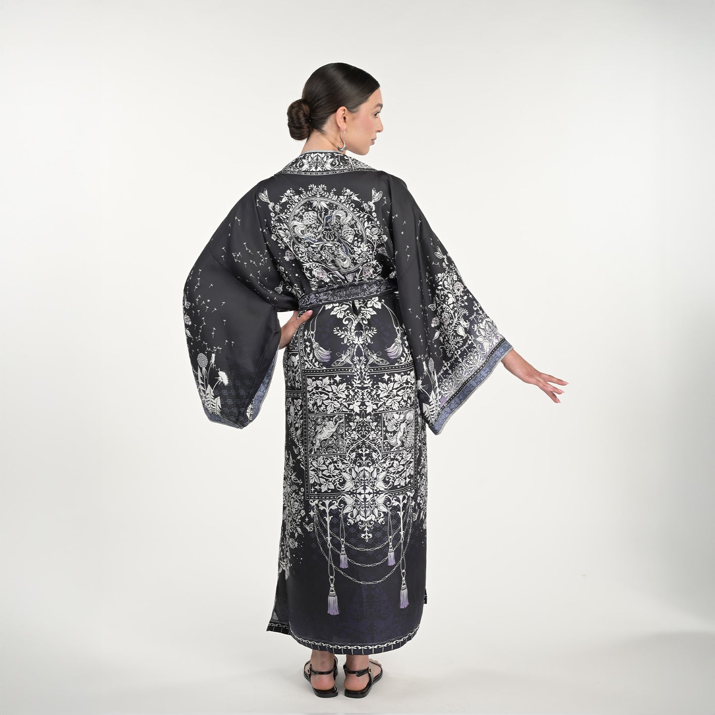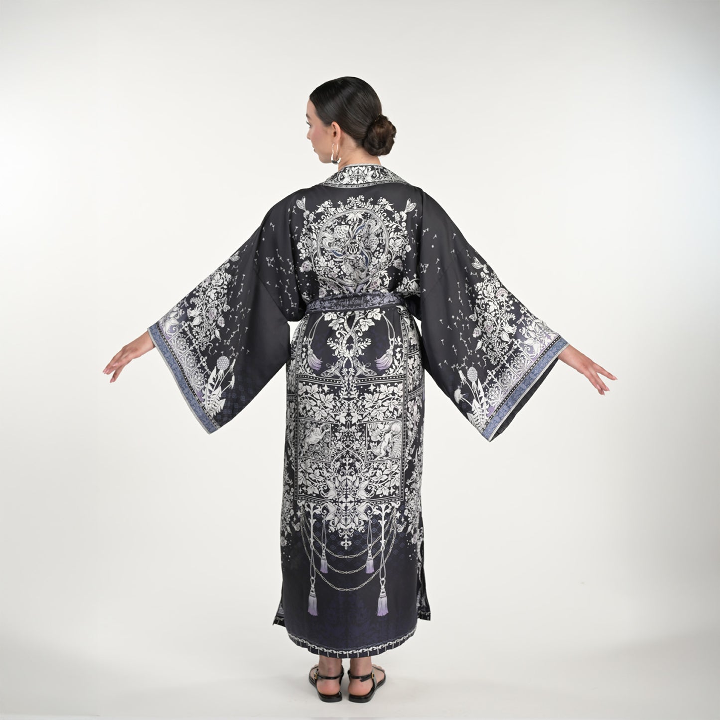 Wrap yourself in effortless elegance with our artisan robe from the tree of life collection. Designed with a flowing full length silhouette and drop sleeves, this piece features two front panel pockets and a coordinating belt that echoes the robe's intricate flora and fauna engineered print. The belt is secured with subtle string loops, allowing for adjustable comfort and style. A wearable work of art, this robe brings thoughtful craftsmanship and timeless beauty into your everyday ritual.